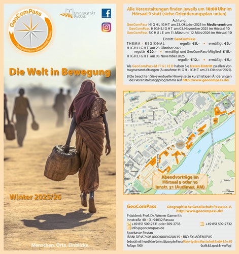 Hier finden Sie eine Übersicht zu allen Programmheften der GeoComPass Veranstaltungsreihe – chronologisch sortiert, beginnend bei den aktuellen Ausgaben.