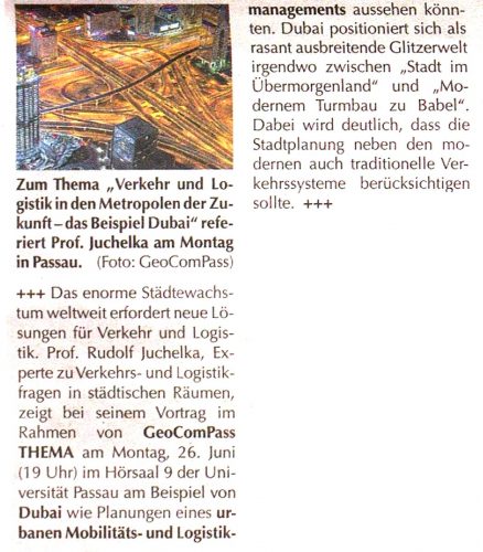 Das rasante Städtewachstum weltweit erfordert neue oder modifizierte Lösungen zur Organisation, Steuerung und Abwicklung für Verkehr und Logistik. Im Vortrag werden dazu in einem ersten allgemeinen Teil grundlegende Probleme des städtischen Verkehrs aufgezeigt und politische und technologische Lösungsansätze vorgestellt und mit Blick auf Nutzungs- und Akzeptanzmöglichkeiten bewertet. In einem zweiten Teil werden an der Fallstudie Dubai, das sich irgendwo zwischen „Stadt im Übermorgenland“ und „Modernem Turmbau zu Babel“ positioniert, Planungen eines urbanen Mobilitäts- und Logistikmanagements vorgestellt. Dabei wird deutlich, dass die Stadtplanung neben den modernen auch traditionelle Verkehrssysteme berücksichtigen sollte.